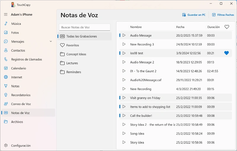 Si tu dispositivo permite grabar notas de voz, TouchCopy puede reproducirlas y copiarlas a tu ordenador. Para acceder a ellas, haz clic en la función Notas de Voz en la lista de TouchCopy.